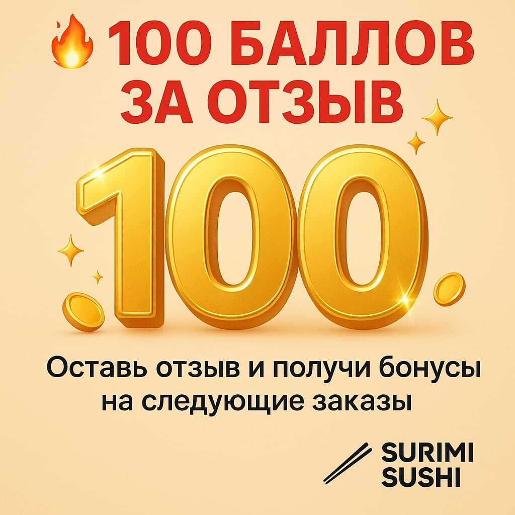 Напиши отзыв о Сурими Суши в Яндекс Картах или 2ГИС — получи 100 бонусных баллов.