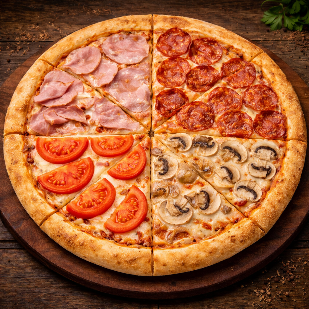 Пицца с несколькими вкусами в одной: ветчина, пепперони, шампиньоны и свежие томаты на тесте с томатным соусом и сыром.
