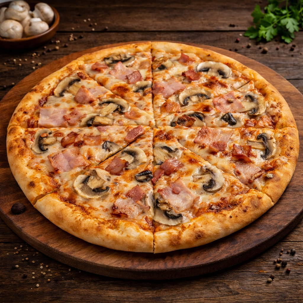Пицца с беконом и грибами — сытная пицца с классическим сочетанием бекона и шампиньонов. Готовится на тесте с пицце соусом и сыром. Подходит для тех, кто любит мясные пиццы с насыщенным вкусом.