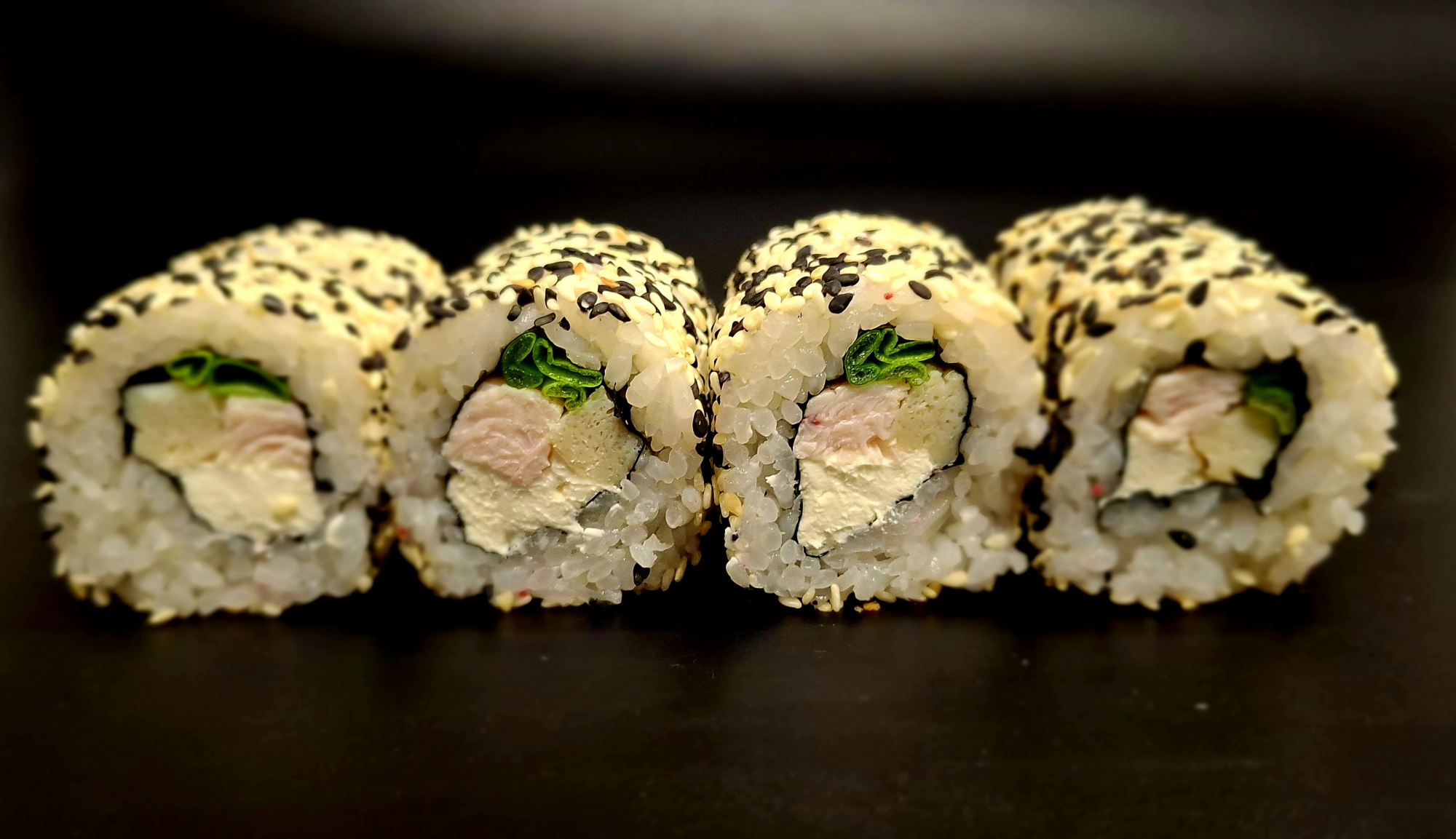 Сытный ролл с копчёной курицей, тамаго и творожным сыром, с зелёным луком и кунжутом.