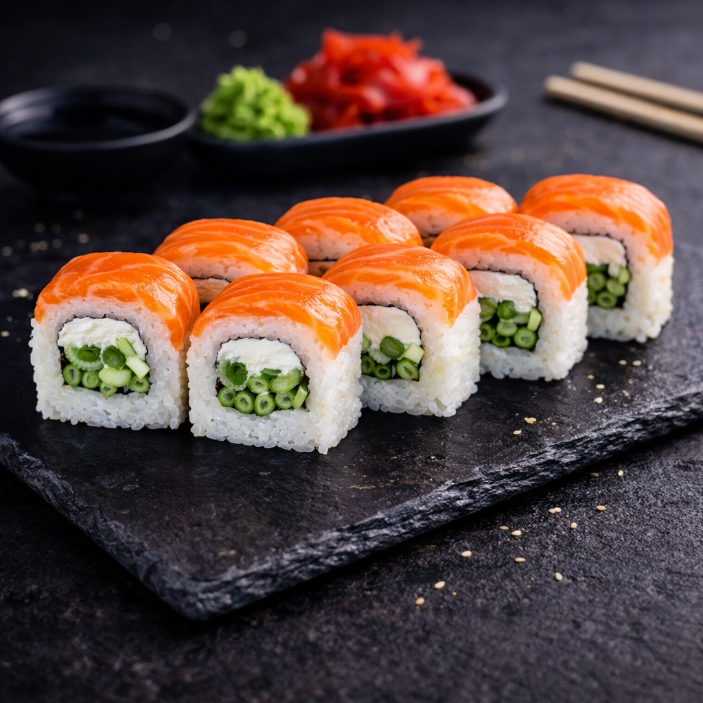 Лёгкий и свежий вариант классической Филадельфии. Зелёный лук добавляет приятную пикантность, подчёркивая вкус охлаждённого лосося и мягкого сыра.