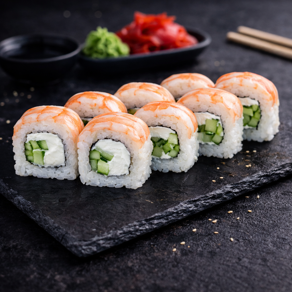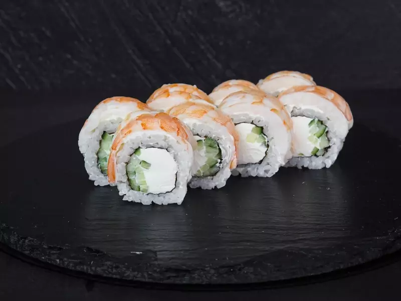 Нежный ролл с креветкой и сливочным сыром, сбалансированный вкус и свежесть. Один из самых популярных вариантов Филадельфии в меню Сурими Суши.