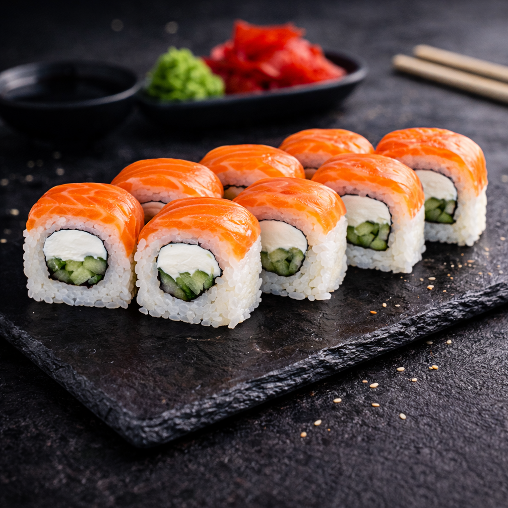 Лёгкий вариант классической Филадельфии. Нежный лосось, сливочный сыр и свежий огурец — гармоничное сочетание вкусов, знакомое всем любителям суши.