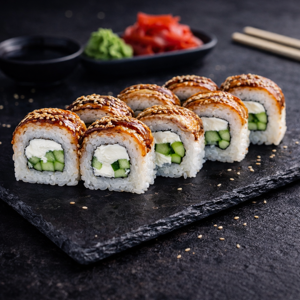 Ролл Унаги Филадельфия — сливочный сыр и угорь под сладким унаги-соусом.