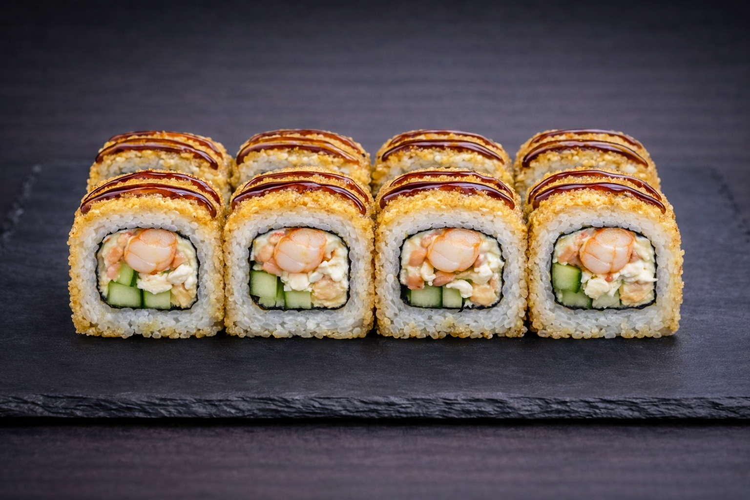 В Сурими Суши этот жареный ролл с креветкой в темпуре — просто находка. Креветка сочная внутри, хрустящая снаружи, огурец даёт свежесть, сыр добавляет кремовости, всё в нори и рисе. Сверху унаги соус — сладковато-солёный, идеально дополняет.
