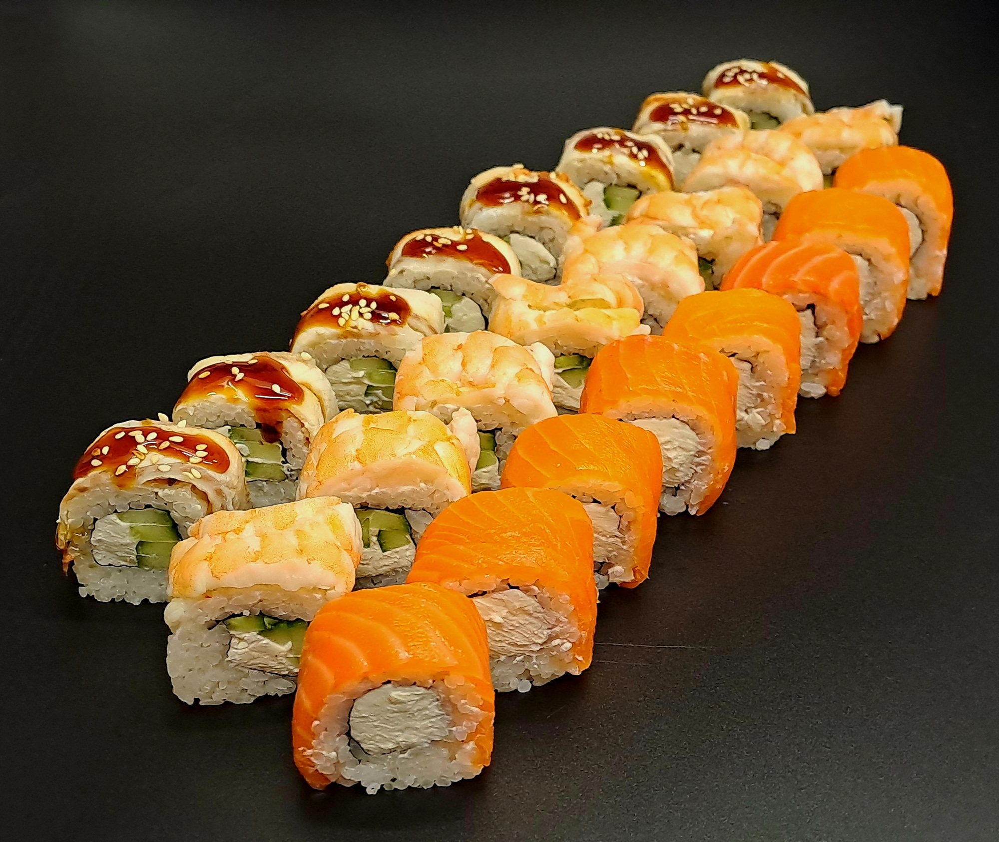 Три легендарных вкуса с нежным сливочным сыром, свежим лососем, угрём и креветкой. Сет отлично подойдёт для небольшой компании или семейного ужина.
