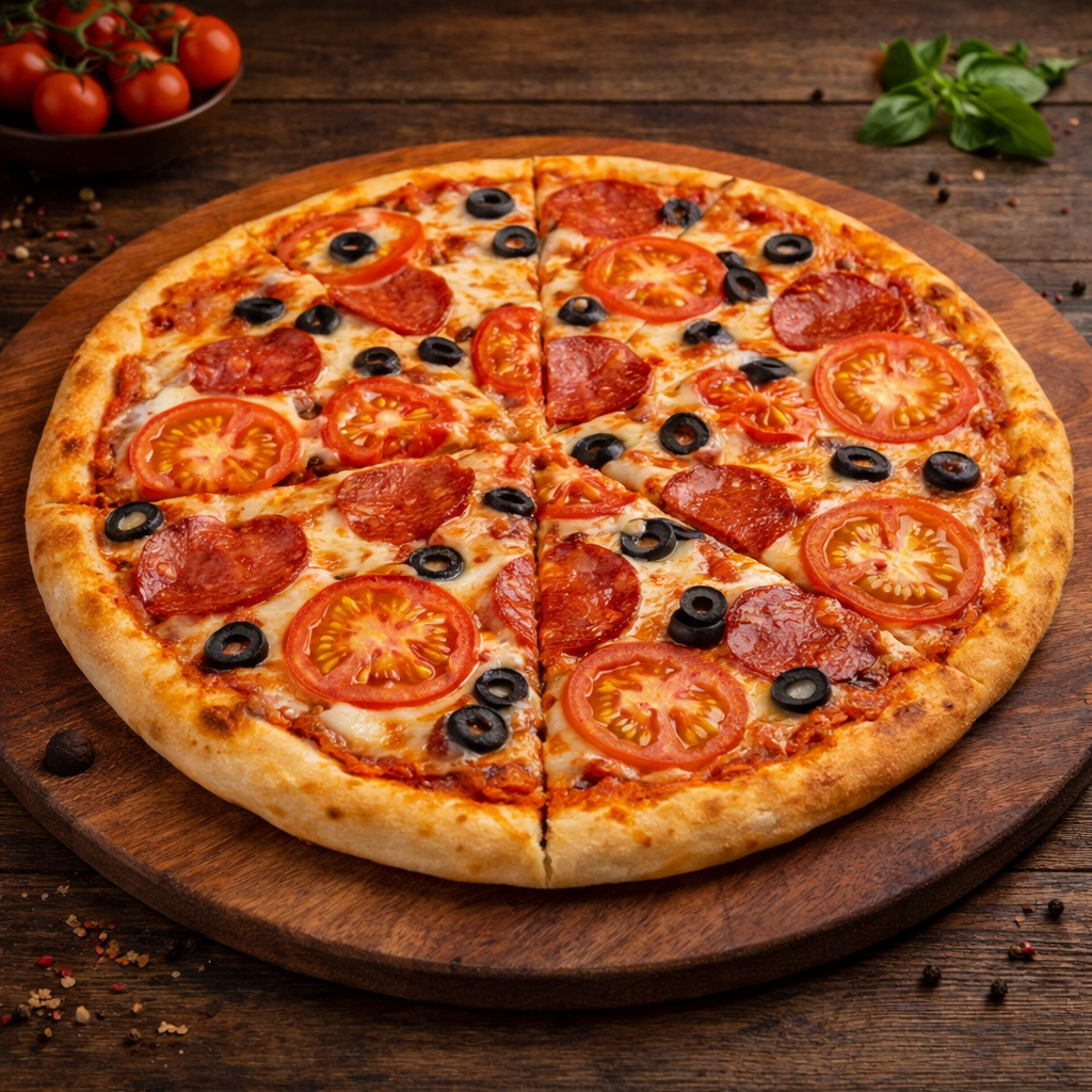 Пицца Неаполитано с пеперони, моцареллой, томатами и маслинами на тесте с пицце соусом.