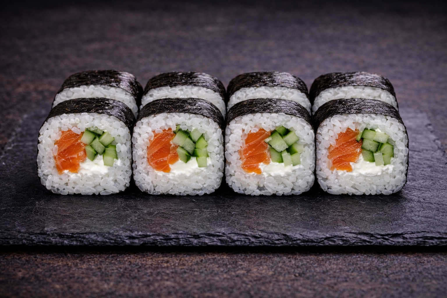 «Гейша» — лосось, свежий огурец и сливочный сыр в классической обёртке. Лёгкий и изысканный вкус.