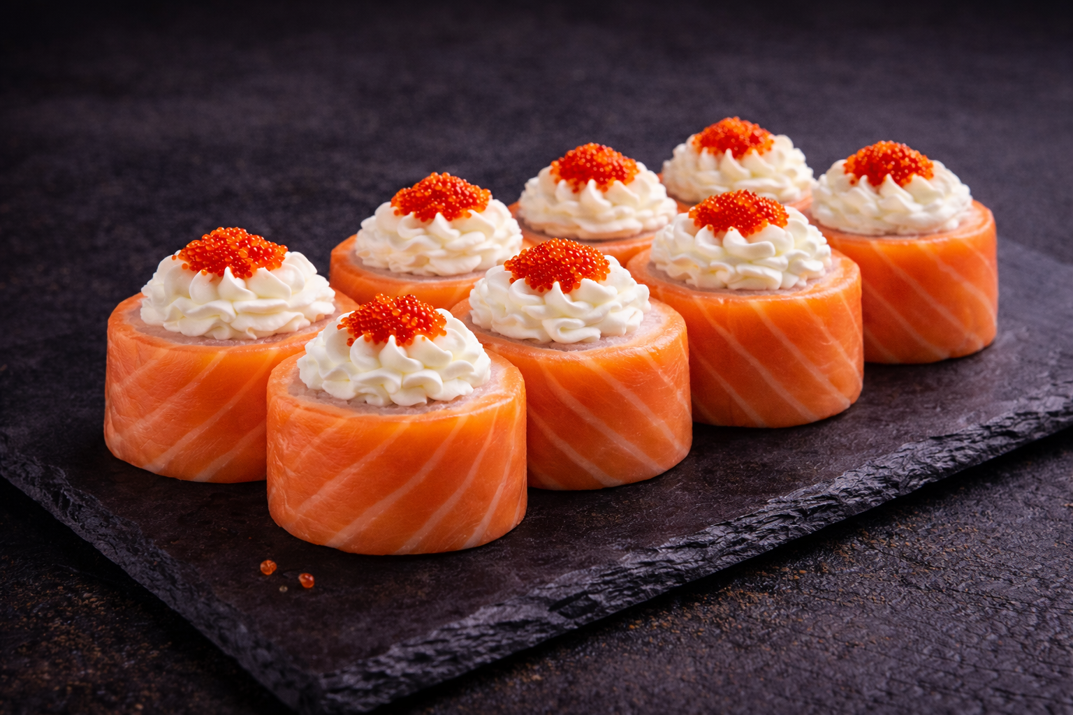 Ролл Филадельфия де люкс — двойной лосось, сливочный сыр и икра масаго для насыщенного вкуса.