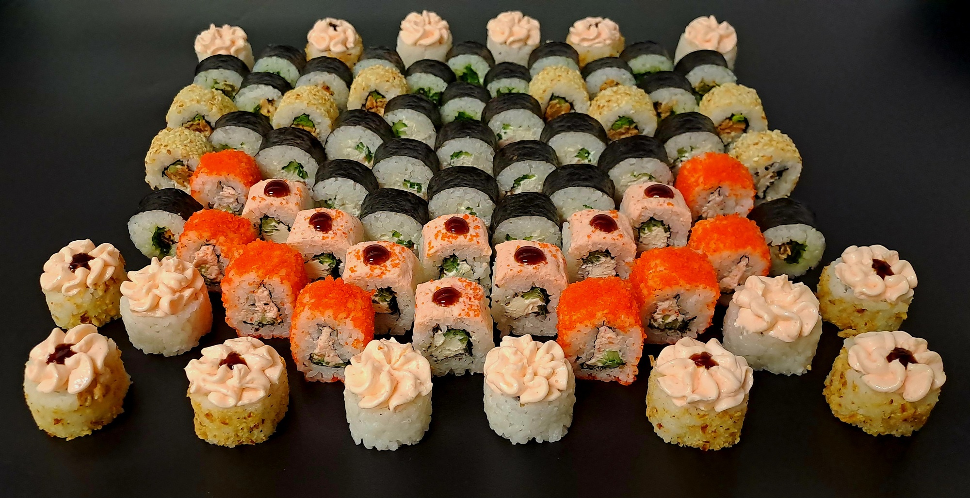 Большой сет из девяти роллов — сочетание сливочных, крабовых и рыбных вкусов. Подходит для компании и праздничных заказов.